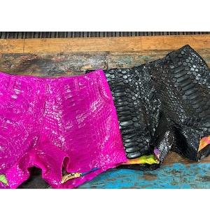Want to be different from the others? We have women's shorts which are made of genuine python snake skin combined with a soft silk fabric as an inner lining to provide maximum comfort. Our shorts still support the traditional concept where the zipper is at the front. On the front there are two pockets and on the waist there is a band for the belt. These shorts are perfect for wearing at home, relaxing or even going to the beach.