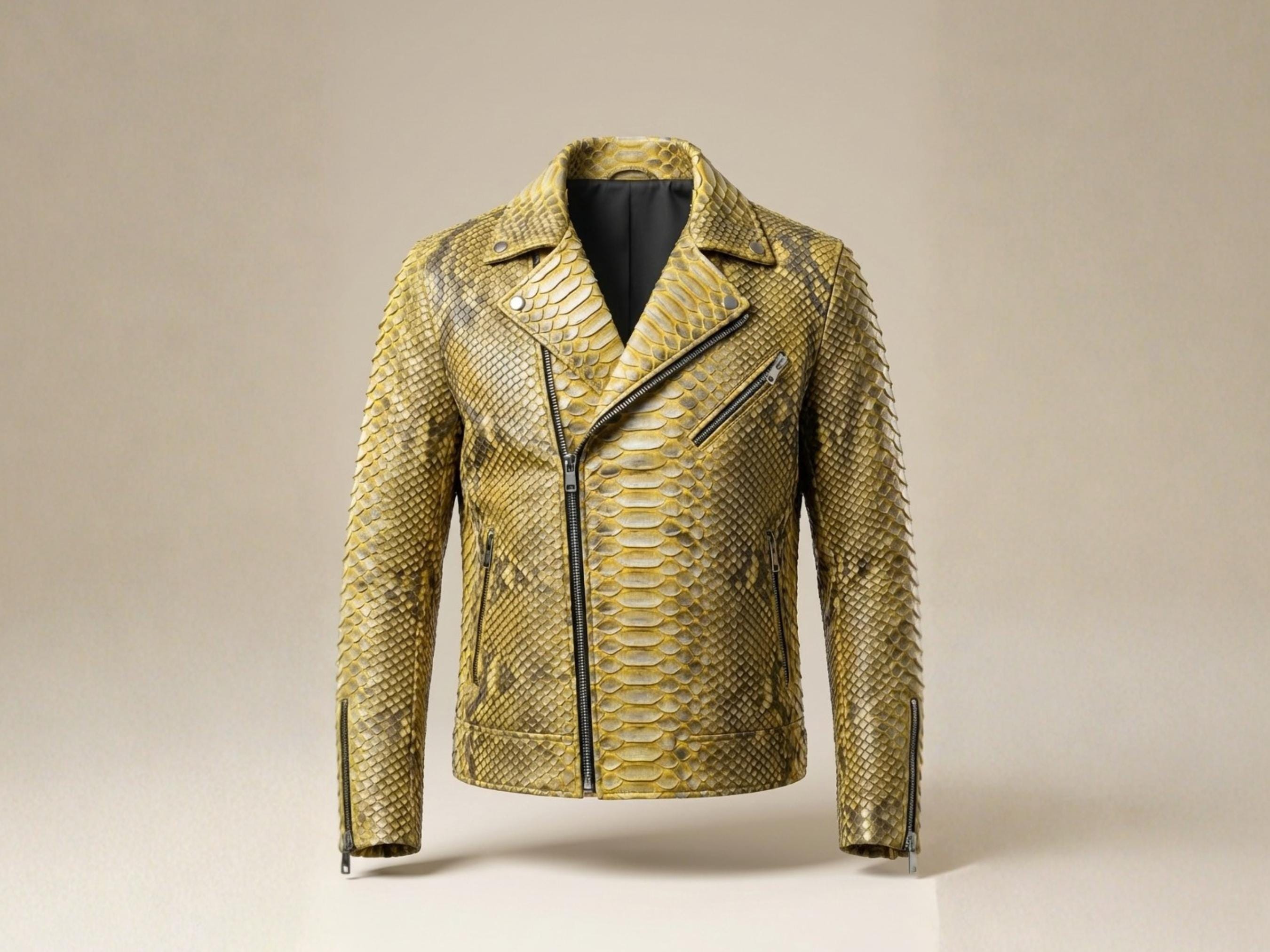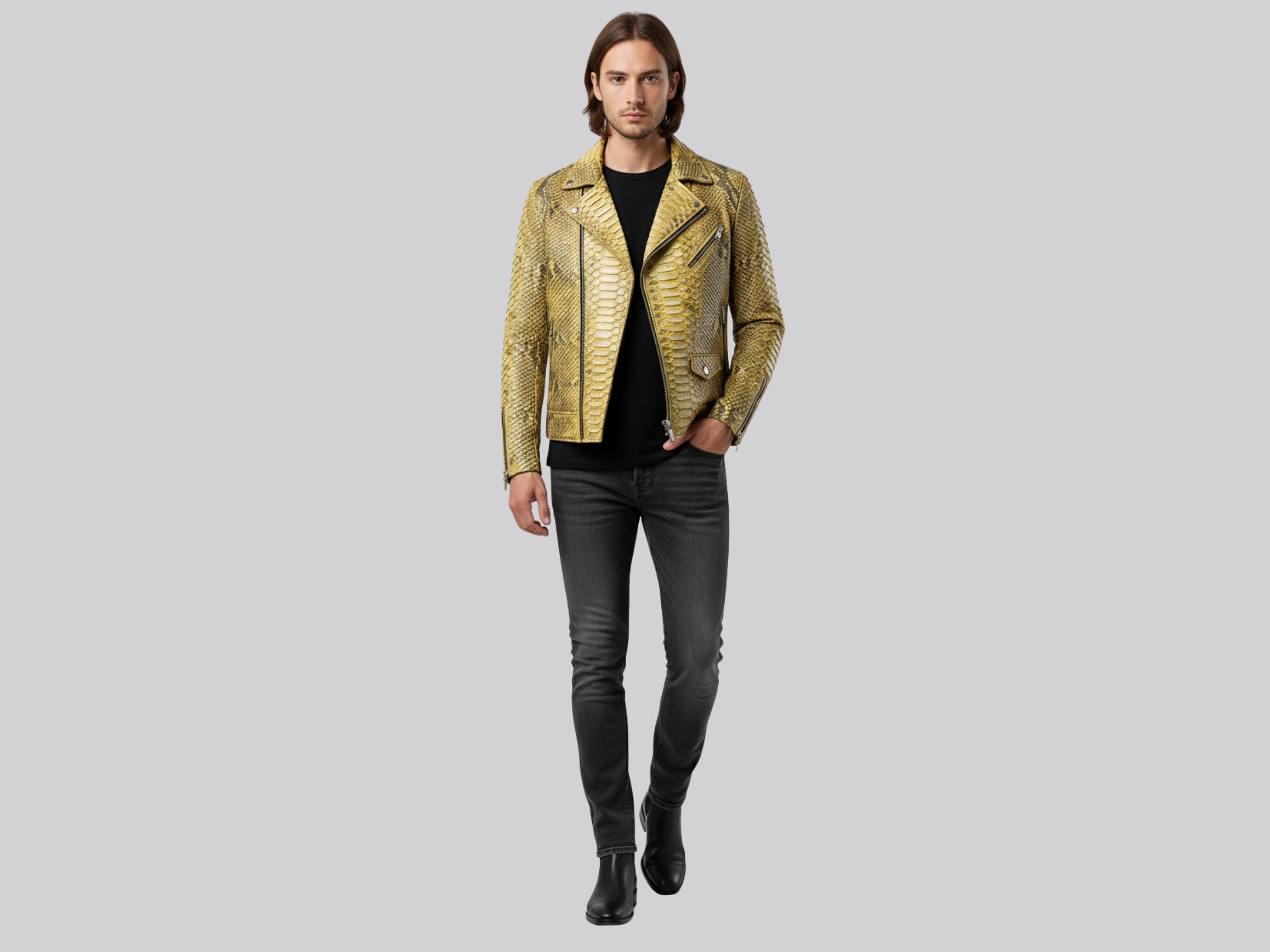 Command attention with this luxury genuine python snakeskin biker jacket, crafted from authentic python snakeskin leather and finished in a striking natural gold tone. Designed for bold personalities and refined wardrobes, this jacket merges exotic elegance with classic motorcycle attitude.