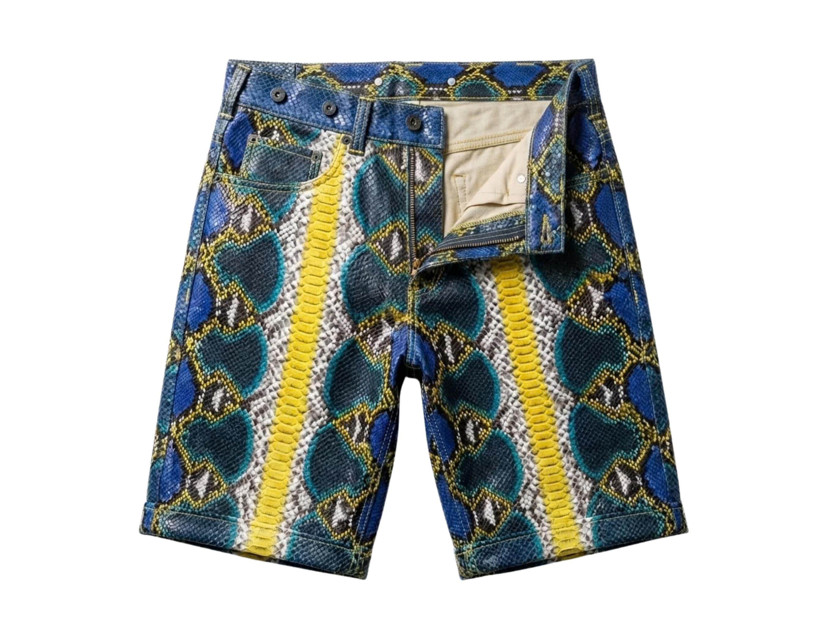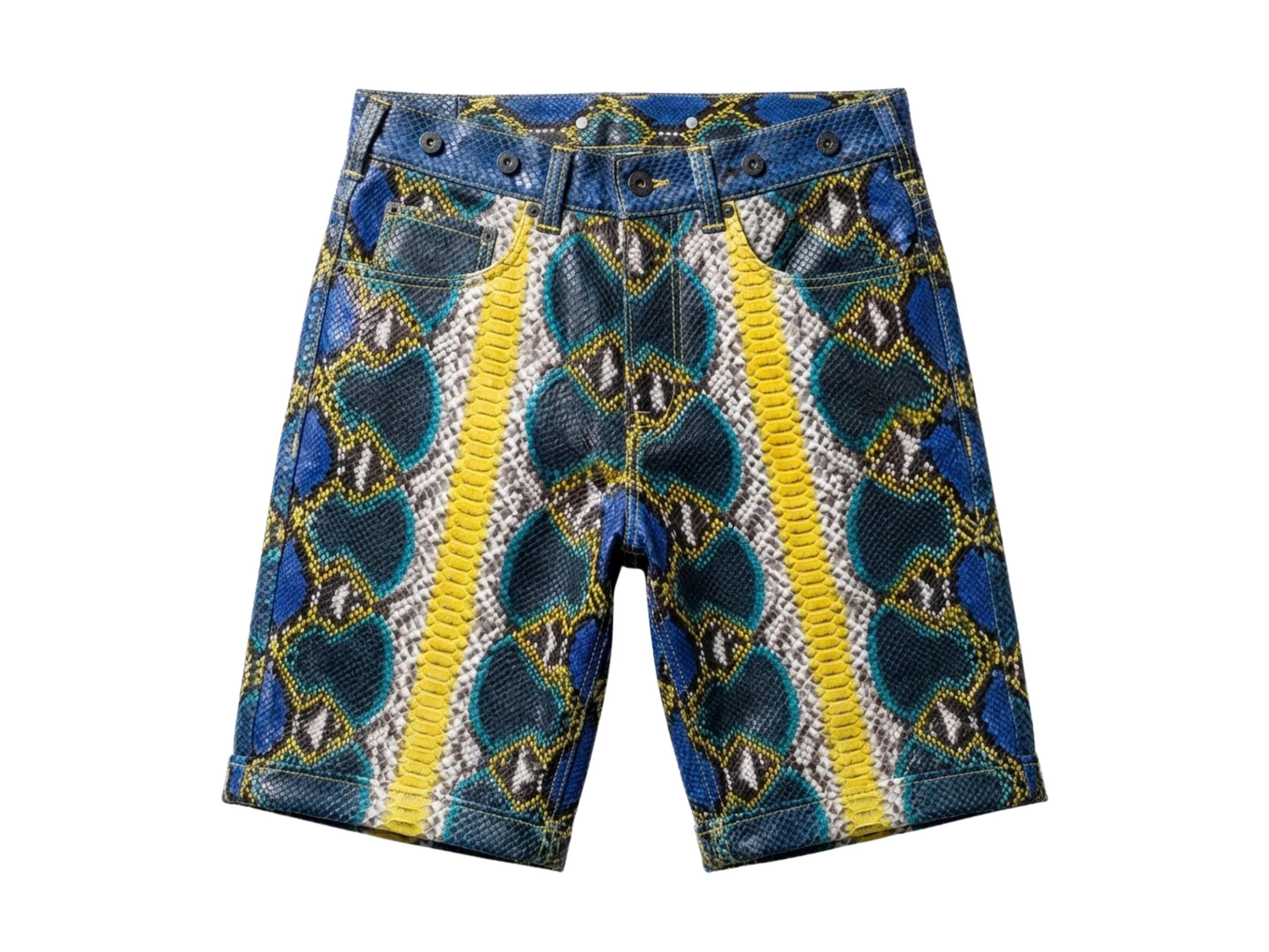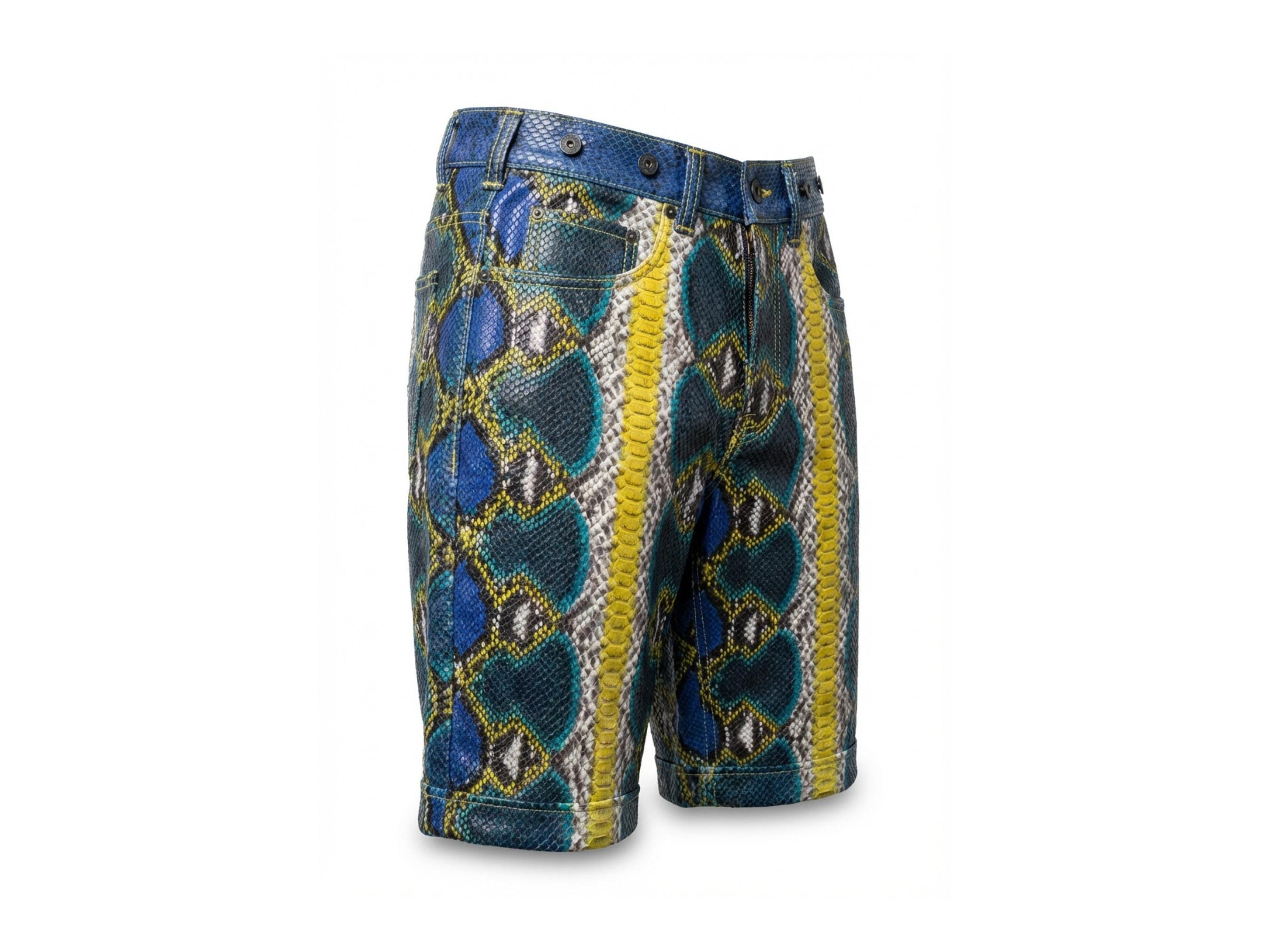 Handcrafted from authentic python snakeskin leather, these shorts showcase a striking blue, yellow, and natural python scale pattern based on the uploaded photos. The natural scale texture and vibrant color variations create a truly one-of-a-kind luxury garment.