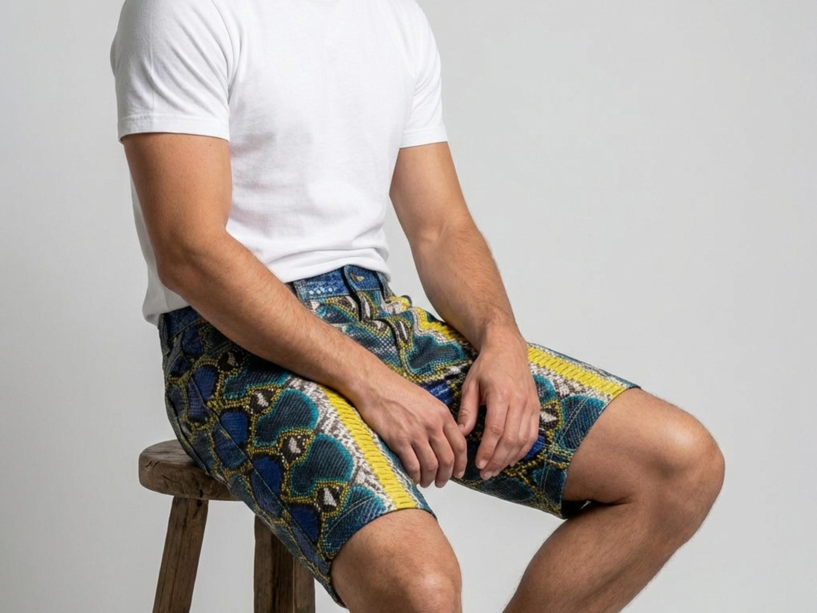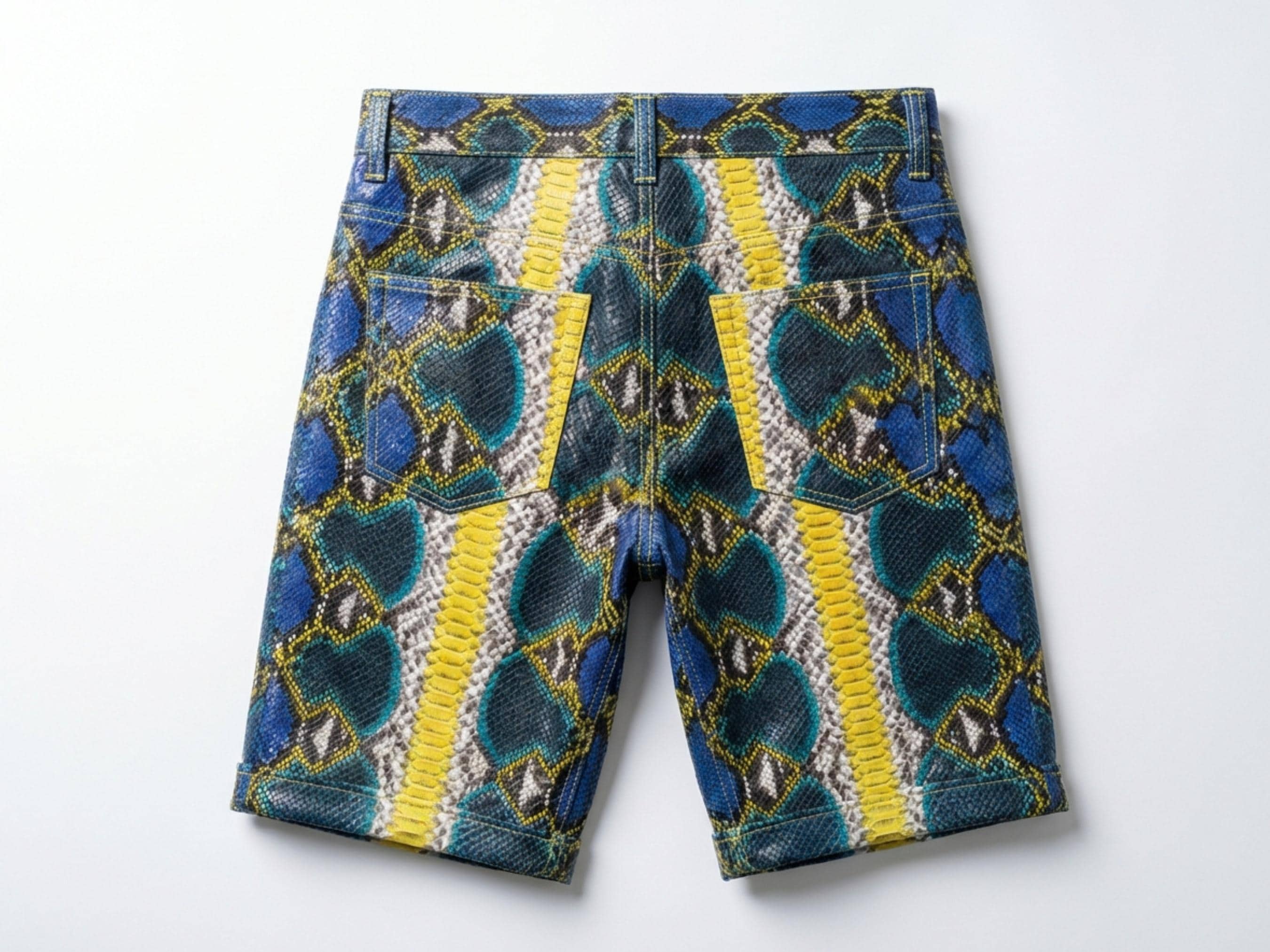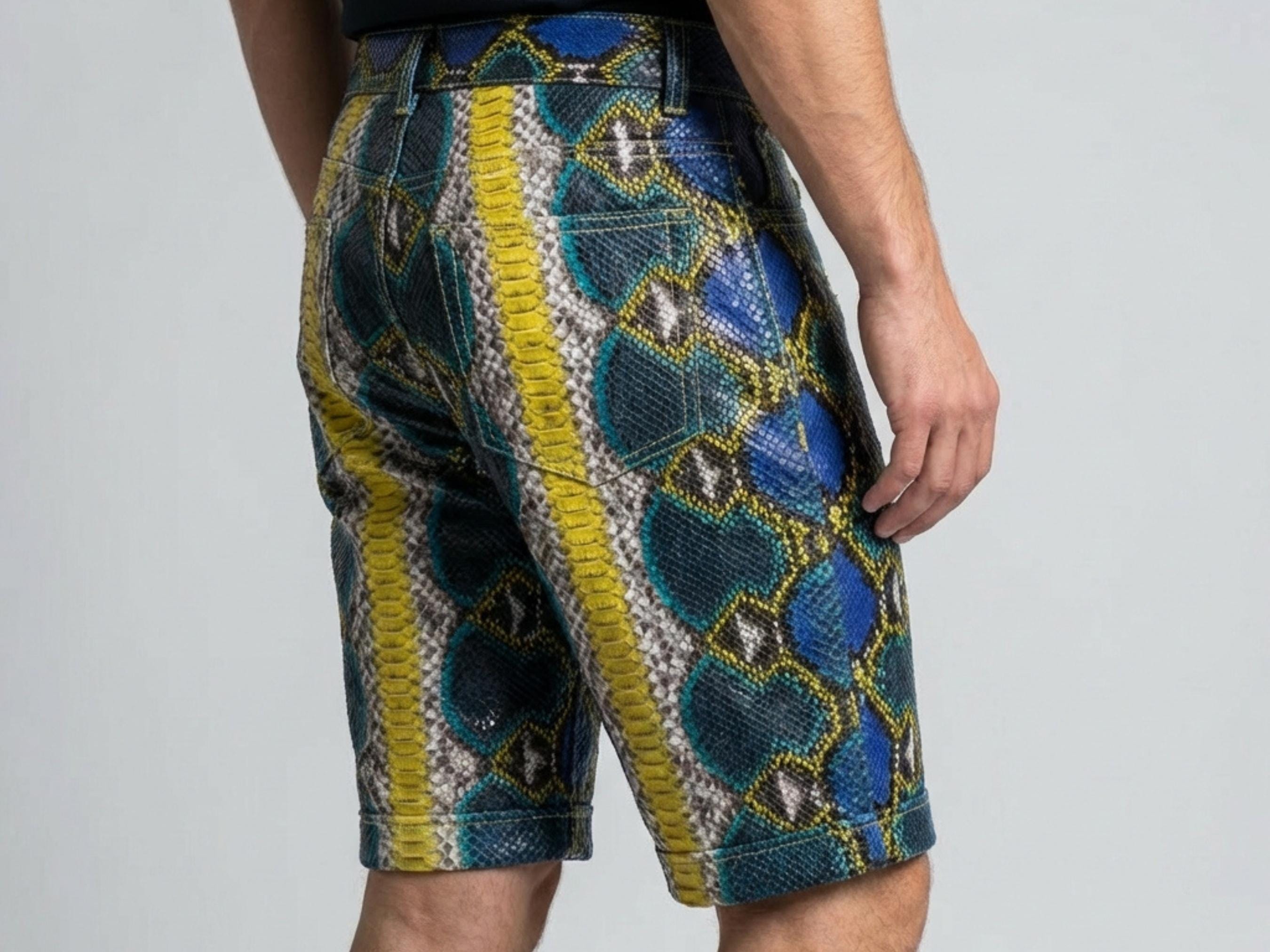 Handcrafted from authentic python snakeskin leather, these shorts showcase a striking blue, yellow, and natural python scale pattern based on the uploaded photos. The natural scale texture and vibrant color variations create a truly one-of-a-kind luxury garment.