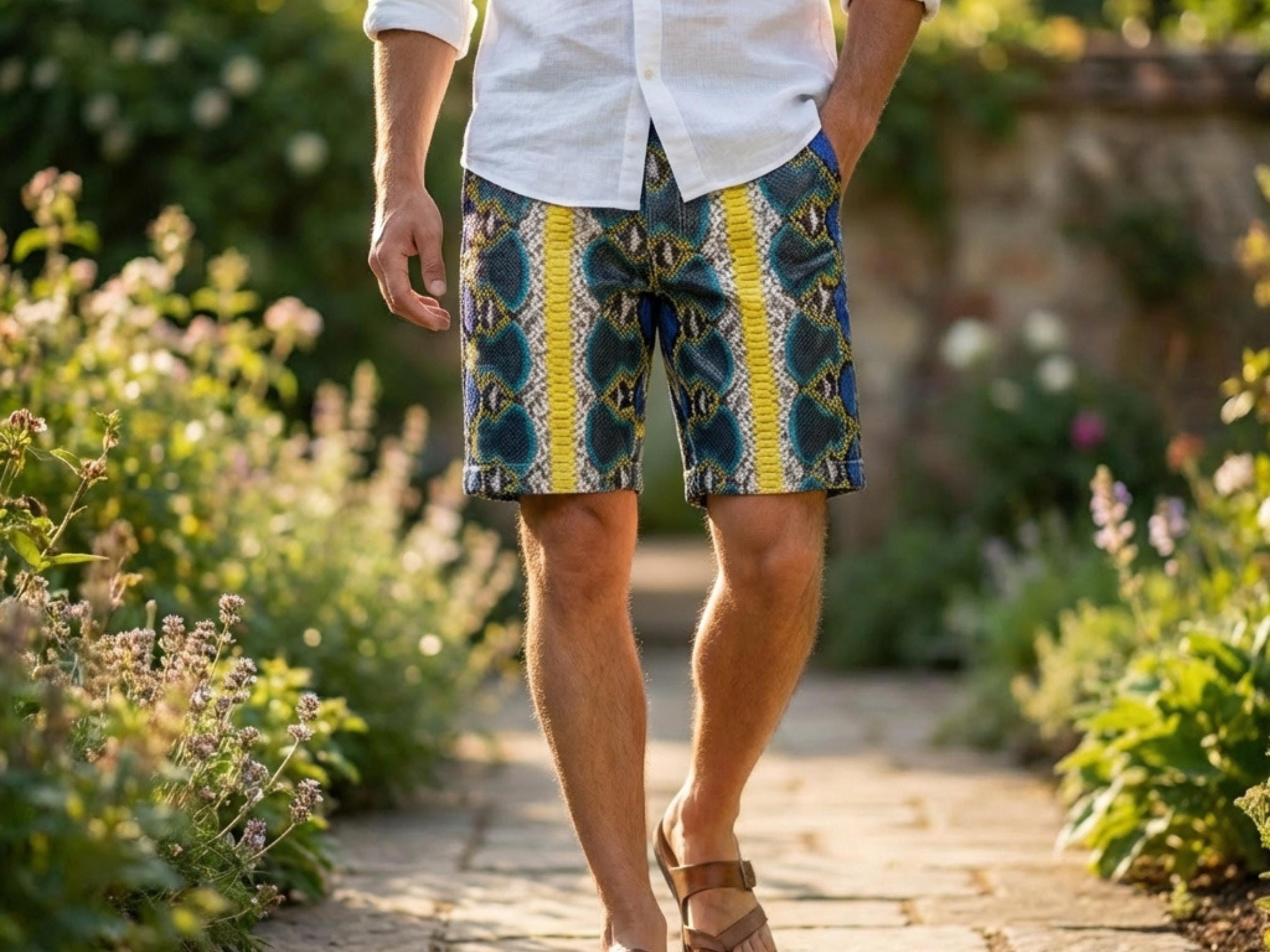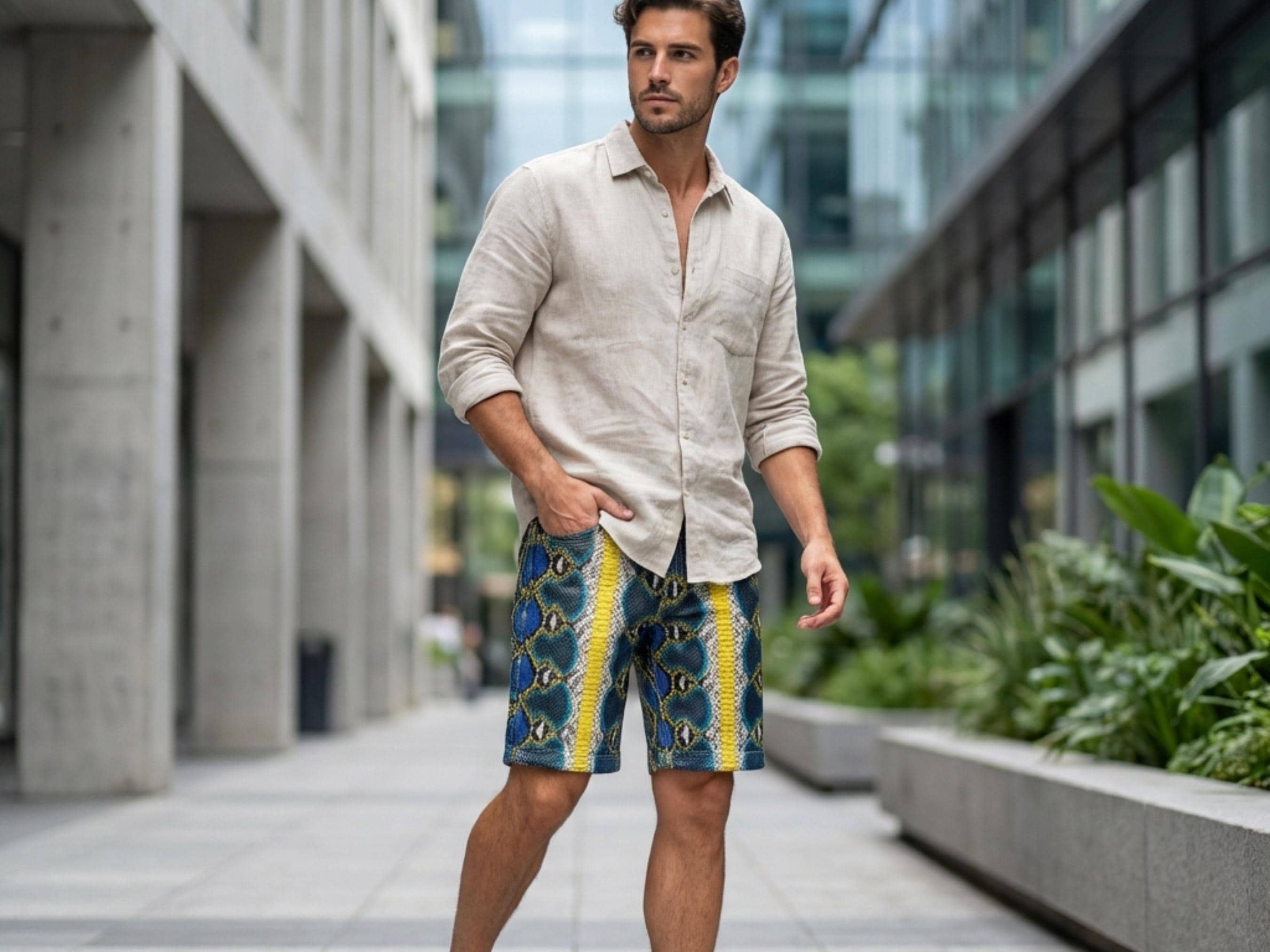 The above-knee cut delivers a modern silhouette that blends designer streetwear with high-end exotic fashion, making these shorts perfect for summer outfits, luxury travel, and statement wardrobe collections.